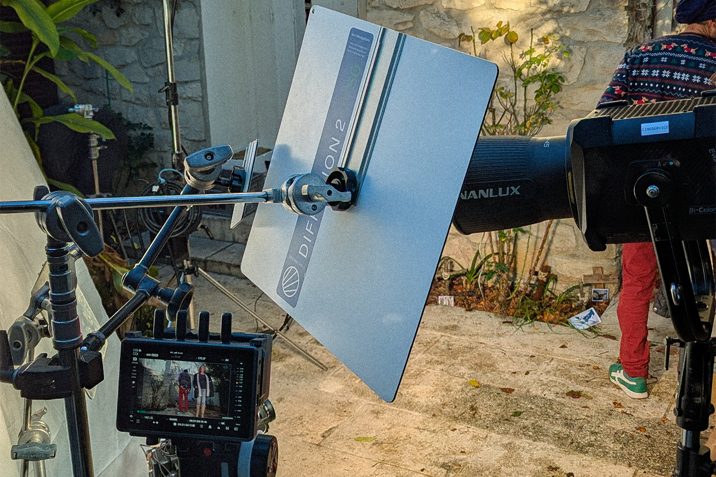 Concernant la caméra, nous avons tourné avec mon DJI Ronin 4D 6K et une série d’optiques Olympus Zuiko OM, prêtée par Hugo Brengues. En lumière, il me fallait utiliser de grosses sources polyvalentes en extérieur pour réduire au maximum les temps d’installation lumière. Mon choix s’est porté sur L’Evoke 1200B, l’Evoke 900C et la découpe AS-PJA-NLM de Nanlux, prêtés par vos soins. Pour compléter l’éclairage à l’intérieur, j’ai utilisé mes deux ALL-IN 2 de la marque Aladdin, mon petit kit de Fiilex P360. Ainsi qu’un classique kit de tubes Astera FP1, prêtés par BandOriginale.